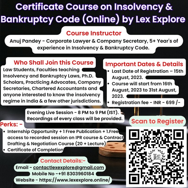 This course has been designed by the experts to provide depth understanding about Insolvency and Bankruptcy Code, 2016. The purpose of this course is to broaden horizons on insolvency and bankruptcy law with detailed concepts and includes the challenges faced, litigations piled up, comparative analysis, recent changes, case laws, etc. Learning from Eminent academicians and industry experts will make the study fruitful and constructive. It will introduce participants to many aspects of insolvency law and also prepare them for further advanced studies and research in Insolvency and Bankruptcy laws.