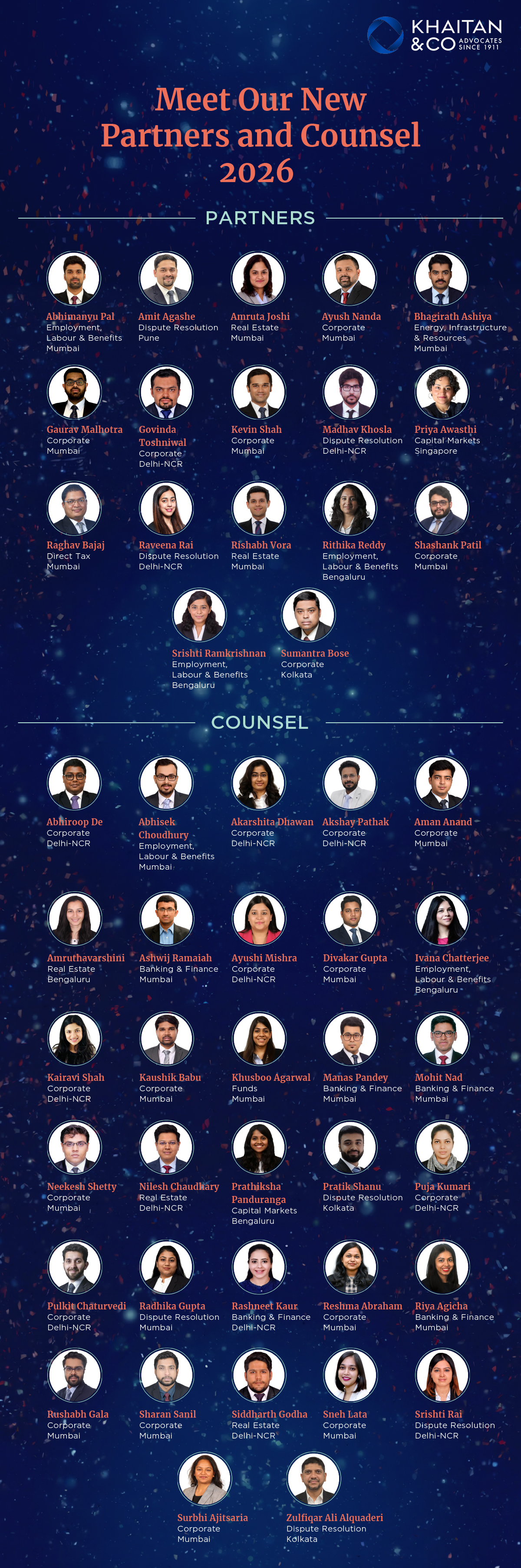 Amar Sinhji, Executive Director – Human Resources, Khaitan & Co, added, “The new promotions highlight both the depth of talent within the Firm and the strength of our culture built over time - one that values merit, and creates clear pathways for growth and success. We remain focused on fostering an environment where our people can realise their potential, while contributing to the Firm’s long-term vision.”
