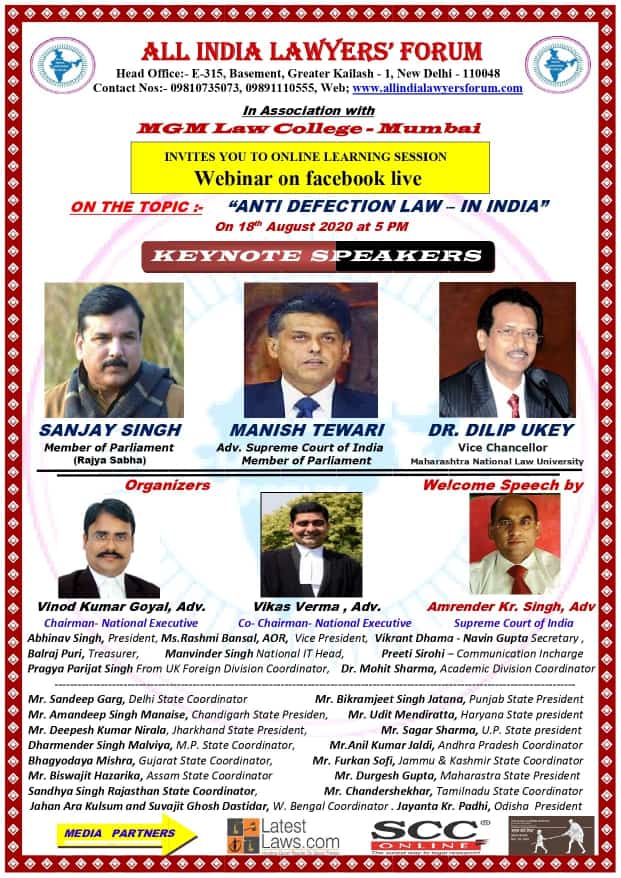 LatestLaws.com is a proud Media Partner of Webinar on 'Anti-Defection Law- In India' organised by AILF in collab with MGM Law College, Mumbai to be held on 18th Aug, 2020.