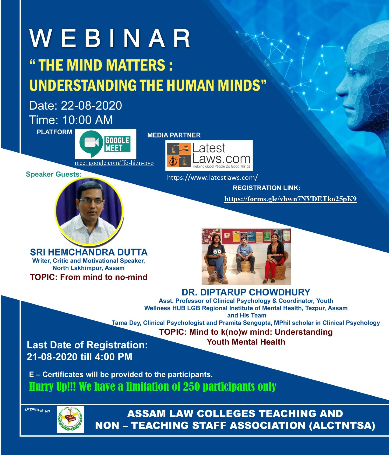 LatestLaws.com is a proud Media Partner of Webinar on 'The Mind Matter- Understanding the Human Minds' organised by Assam Law Colleges Teaching and Non - Teaching Staff Association to be held on 22nd Aug, 2020.