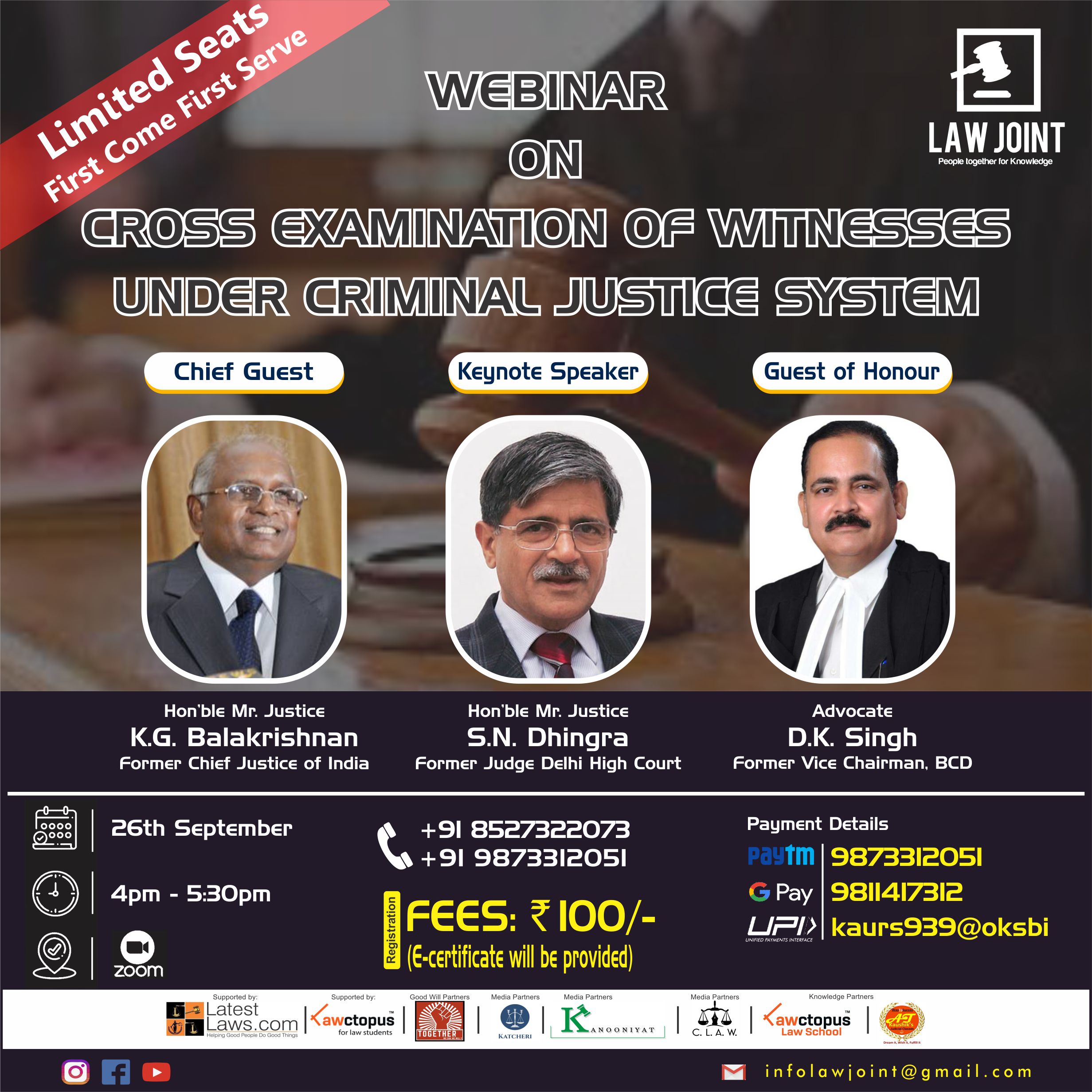 LatestLaws.com Partner Event: Law Joint presents Webinar on 'Cross Examination of Witnesses under Criminal Justice System' on 26th Sept @4:00 PM; Register Now!