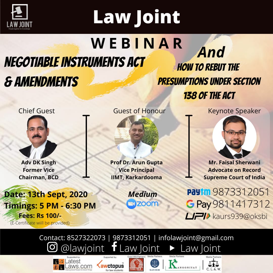 LatestLaws.com is a proud Media Partner of Webinar on 'Negotiable Instruments Act & Amendments' and 'How to rebut Presumptions under Section-138 of the Act' organised by Law Joint to be held on 13th September, 2020.