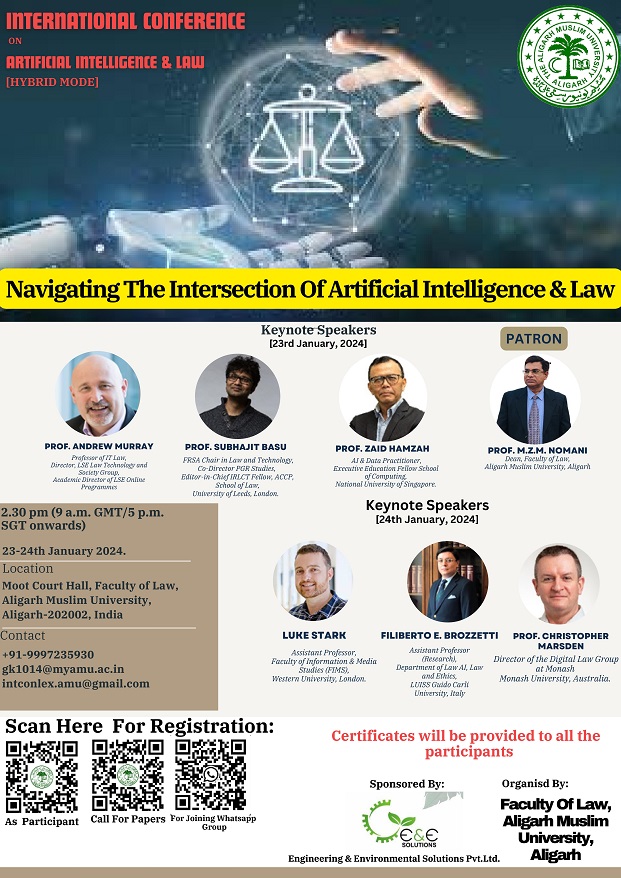 A wide range of legal and technological experts came together for the International Conference on AI and Law, which was organized by the Faculty of Law at Aligarh Muslim University, to discuss the complex interrelationship between artificial intelligence and the legal domain. The conference’s theme, “Navigating the Intersection of AI and Law ” sought to analyze the complex interactions that exist between these two fields.