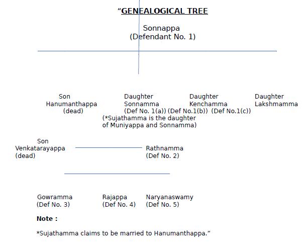 3. Defendant No. 1 Sonnappa died during the pendency of the suit leaving behind two sons - Venkatarayappa and predeceased son - Hanumanthappa and three daughters - Sonnamma, Kenchamma and Lakshmamma. Sonnamma, Kenchamma and Lakshmamma have been brought on record as legal heirs of defendant No. 1. The plaintiff - Sujathamma, maternal grand-daughter of Sonnappa, claims to have married Hanumanthappa on 7th March, 1986. Hanumanthappa died on 15th October, 1986. The claim of the plaintiff is that she is entitled to the share of the estate of Sonnappa, as wife of deceased Hanumanthappa. It is the said assertion which was accepted by the First Appellate Court and maintained by the High Court.
