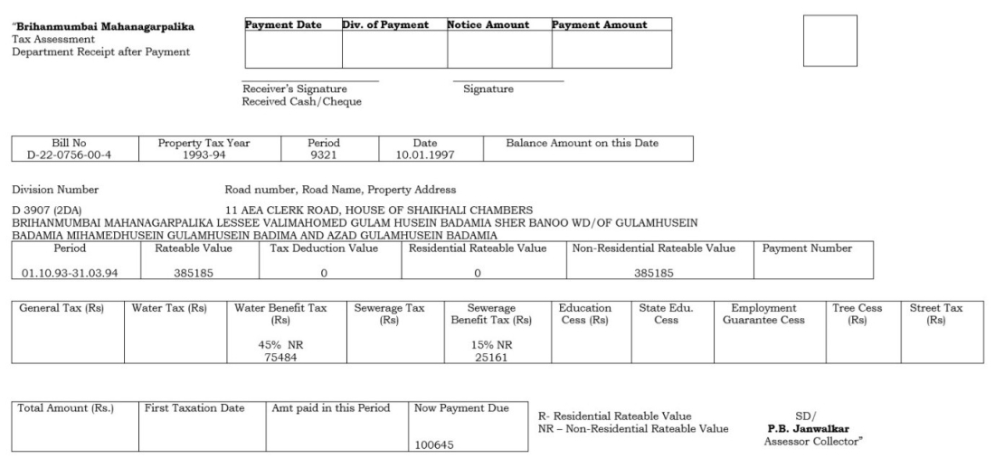 4. The appellant thereafter in 1997 started raising bills for the period from 1st October, 1993 including towards water benefit tax in respect of the subject premises. In January, 1997, seven bills of water tax and water benefit tax were raised in respect of the said building (for the period from 1st October, 1993 to 30th September, 1998) aggregating to L 10,60,312/-( Rupees Ten Lakh Sixty Thousand Three Hundred Twelve Only). The respondent No.3 paid his share of the bill in protest but respondent No.1, on advice, refused to pay his prorata share of the bill.