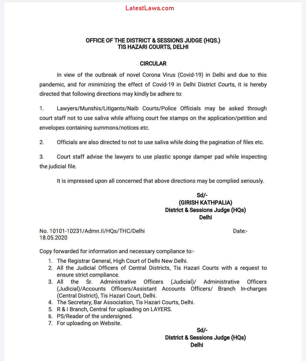 The above directions have been passed to minimize the effect of COVID-19 in the Delhi District Courts.