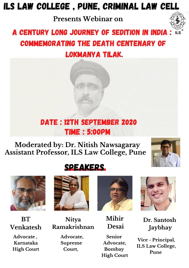 ILS Criminal Law Cell presents a webinar on the topic “A Century long journey of Sedition in India: Commemorating the death centenary of Lokmanya Tilak”. The webinar aims at getting insights of professionals by comparing and analysing the current sedition laws with the laws used in colonial India during the landmark trials of Lokmanya Tilak .