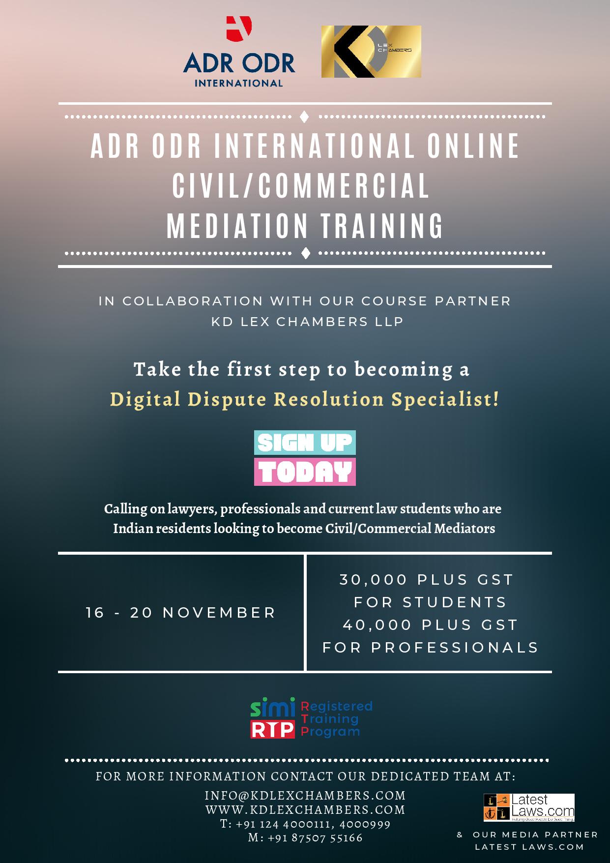 ADR ODR International in collab with KD Lex Chambers LLP presents 'Online Civil/ Commercial Mediation Training Programme' from 16th - 20th Nov, 2020.