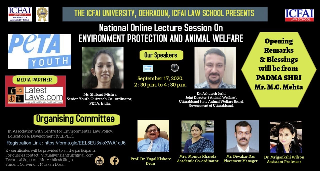 LatestLaws.com is a proud Media Partner of National Online Lecture Session on 'Environment Protection and Animal Welfare' organised by ICFAI Law School to be held on 17th September, 2020.